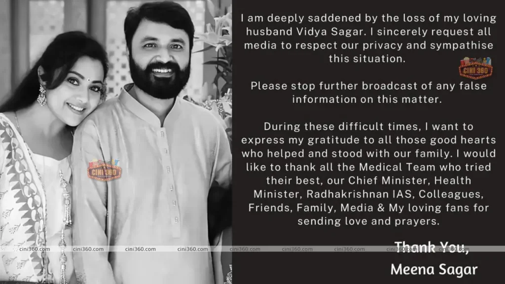 Actress Meena’s husband Vidyasagar passed away on 28 June 2022 night at a private hospital in Chennai. His lungs and heart had already failed and he was admitted to a private hospital in Chennai for a few weeks with plans to undergo an organ transplant. He was not able to undergo organ transplant, as organs were not available.